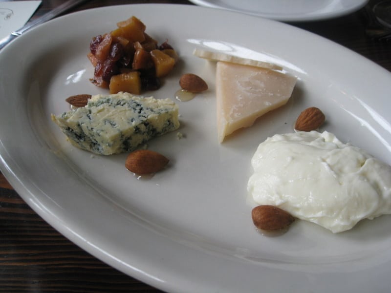 Our eyes got big looking over all of the small plate and nibble options, but in the end, we stuck with a very light dinner: a cheese plate, meat plate, two different kinds of flatbreads, and 2 glasses of wine. At $3/pop, the flatbread happy hour special definitely hit the spot. I didn’t quite get the ‘flatbread’ title, though, as what came out of the kitchen more resembled doughy focaccia topped with sauce, andouille sausage and tomatoes. It was certainly good, but far from what I’d call a flatbread.