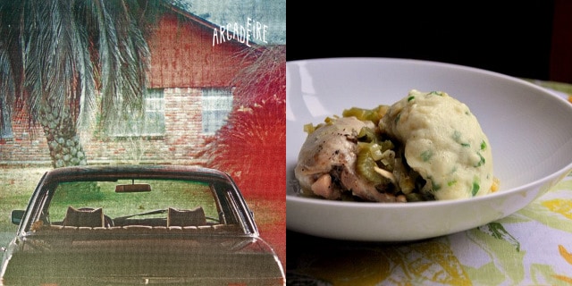 I tend to associate certain foods with certain places. For example, I associate chicken and dumplings with the suburbs. This may be because it is one of those recipes that my mom used to make for me as a kid back in good-old suburban Beavercreek, Ohio; just as I suspect countless moms have made the recipe for their kids in suburbs all across the country. But just because it is from the ‘burbs, doesn’t mean it is boring and beyond a little culinary jazzing-up. In fact, the chicken and scallion dumplings recipe that Kasey is featuring today is definitely a little more “culinary-sheik” than your average chicken and dumplings recipe. Nonetheless, it still retains the heart and soul of the recipe many of us know and love. And so I chose Arcade Fire’s latest album, The Suburbs, as my pairing for this recipe, which, according to Arcade Fire frontman Win Butler, “is neither a love letter to, nor an indictment of, the suburbs – it’s a letter from the suburbs.”