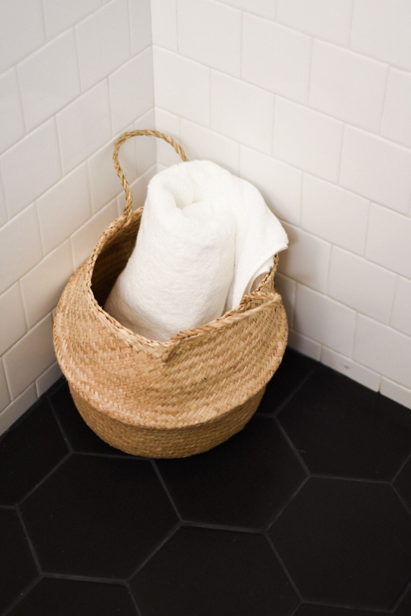 I’ve long been a fan of Rejuvenation and Schoolhouse — many of our light fixtures and hardware throughout the house are from them — so I was thrilled to partner with both brands. I love the two Schoolhouse Nova L Sconces that frame the Rejuvenation oil-rubbed bronze mirror and the simple Rejuvenation wall hooks (single Vernon hook in oil-rubbed bronze and Linfield double hook in polished nickel) for towels. Given that this bathroom is on our lower level, it’s mostly going to be used by guests, so we didn’t plan for too much storage in here. Instead, we had a built in shower niche, where we can keep guest shampoo and conditioner. I added some simple Ikea baskets for towels, a blow dryer/etc, and a few Brooklinen candles that we could light for ambiance. The Brooklinen AM-PM candle set includes perfume grade candles in heavenly scents like Magic Hour and Dusk.