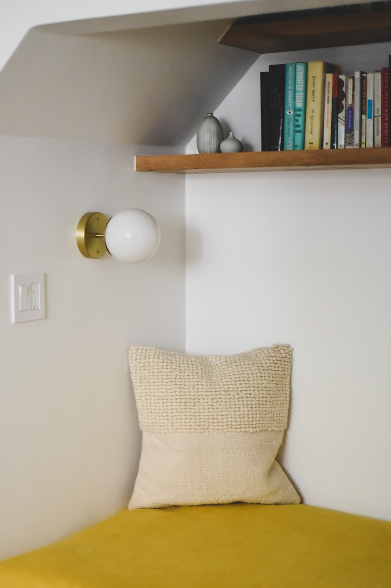 The Schoolhouse Electric Nova sconce adds the perfect amount of light, and an outlet means the reading nook doubles as a workspace, too. On evenings when we want to relax down here, we turn off the cans, turn on the Schoolhouse nook sconce, and reminisce about what it will be like to have friends inside this new space — in real life.
