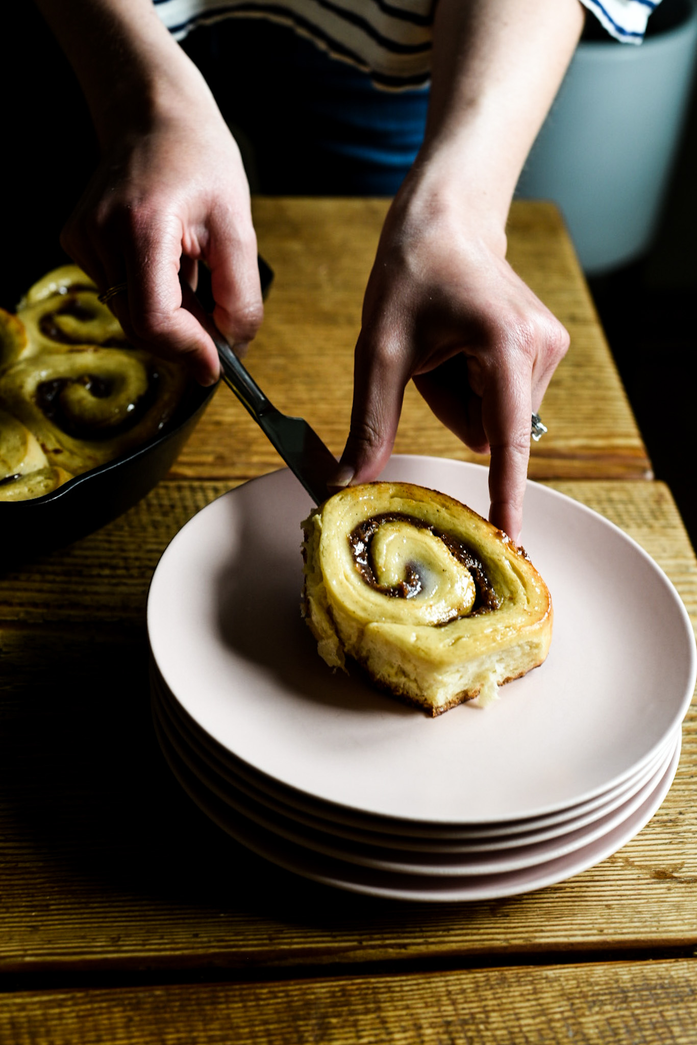15. Whisk together the powdered sugar, vanilla bean paste, and 3 tablespoons of buttermilk. Brush the glaze over the warm buns and serve directly from the skillet.