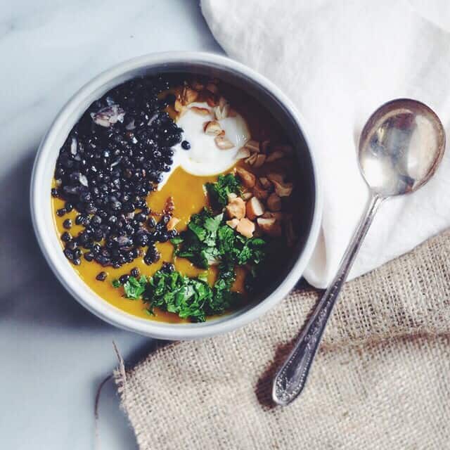 Curried Sweet Potato Soup with Crispy Black Lentils