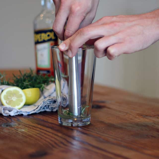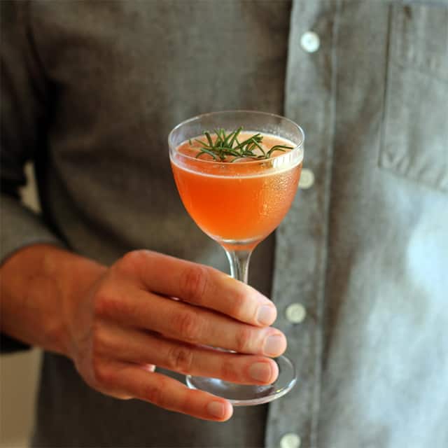 Strain the drink through a tea strainer so that you don’t end up with little bits of rosemary in the glass. Take another sprig of rosemary and smack it in your palm to release the oils before you set it on top of the drink as a garnish.