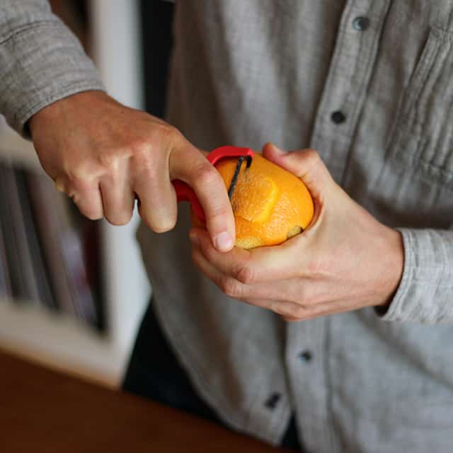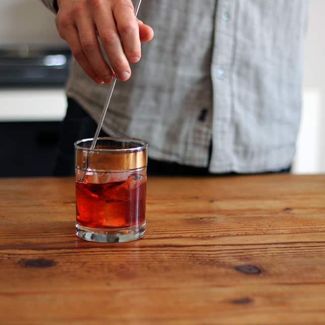 Combine all ingredients in the glass. Add a couple of ice cubes (I recommend using Tovolo Perfect Cube Ice Trays to make your ice). Stir until chilled (10 seconds, at least). Take one strip of orange peel and gently squeeze it over the drink to release the oils. Then, rub the peel around the rim of the glass and drop it into the drink for garnish. If you’re feeling adventurous, try a flamed peel (see video).